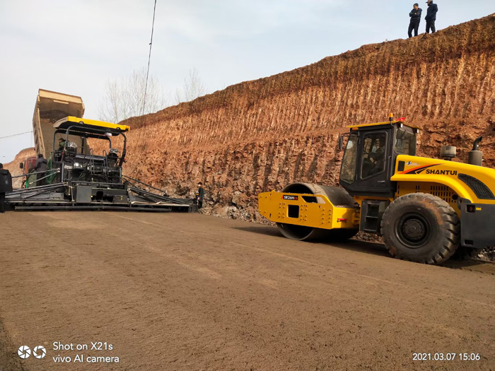 山推SRP12-C5 MA攤鋪機與SR26H-C5壓路機完美配合,助力河南某道路水穩(wěn)基層建設,施工寬度10m,作業(yè)厚度230mm,連續(xù)三層施工作業(yè),高效,高質量施工,獲得客戶的一致好評。